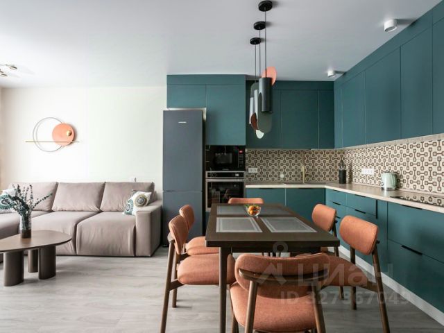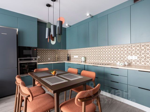 В кухонной зоне кухонная мебель 7 погонных метров с встроенными плитой, микроволновкой, духовкой, ПММ, холодильником Liebherr, измельчителем бытовых отходов, сенсорной мусоркой. Деревянный раздвижной стол с 6 стульями.