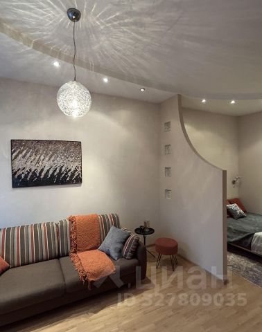 Внутри квартиры: Квартира (38.4 кв.м.) студийного плана, спальню отделяет от кухни раздвижная перегородка.