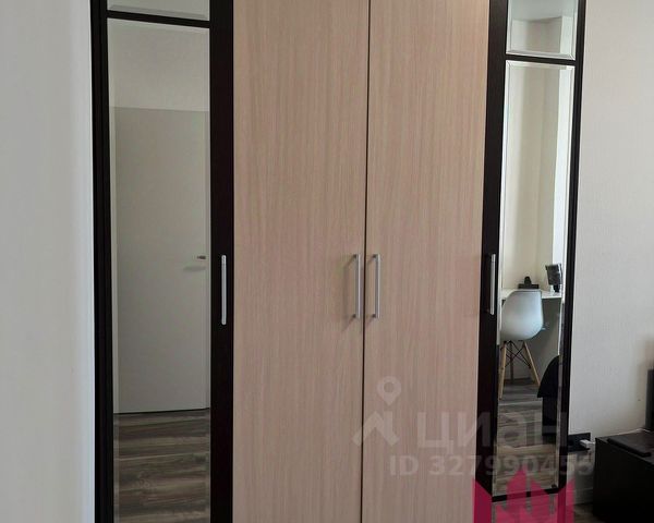 В спальне: большая двуспальная кровать с ортопедическим матрасом, комод для хранения вещей, вместительный шкаф-купе, смарт ТВ (43 дюйма), письменный стол, пункт беспроводной зарядки рядом с кроватью.
