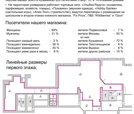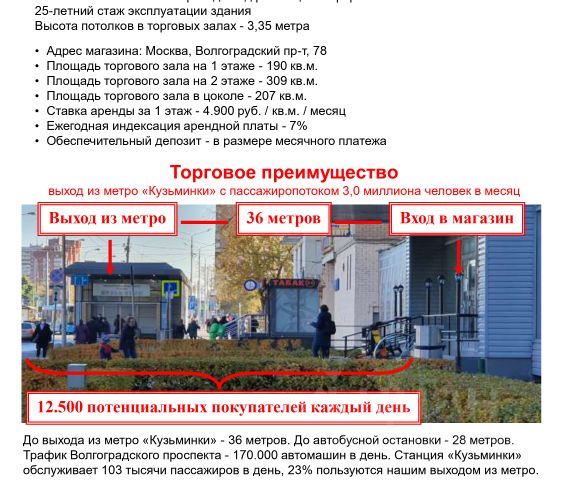 Добрый день, коллеги! Ищем соседа в 3-уровневый универмаг для "Пуховики", "Улыбки Радуги", "Hobby Games" и "Anex-Tour" на место магазина сети "Читай Город" площадью 309 кв.м. (ЕСТЬ ВОЗМОЖНОСТЬ арендовать помещение частично или объединить этажи!) Ставка первого года аренды — 4.000 руб. / кв.м / месяц Предлагаем в долгосрочную (от 11 до 60 месяцев) аренду качественное торговое помещение с хорошим свежим ремонтом в шаговой доступности от метро "Кузьминки" (уличный трафик у входа в магазин превышает 12 тысяч пешеходов в сутки). Удачная локация, высокий пешеходный и автомобильный трафик, шикарные витрины, пандус для колясок, остановка общественного транспорта, адекватный собственник — в наличии все составляющие успешного ритейл-проекта. Очень рассчитываем на обратную связь, даже если какой-то из параметров (площадь, цена, срок) Вам не подходит. Мы открыты для переговоров и поиска компромиссов! Ждём вас на предпоказе и надеемся на продуктивное сотрудничество!