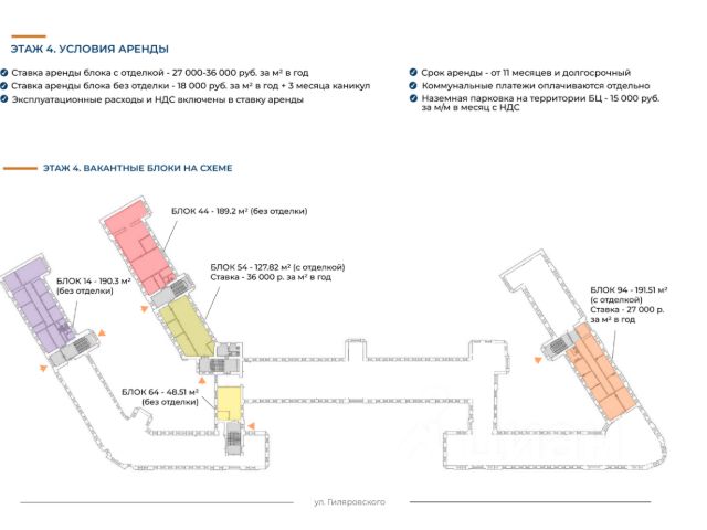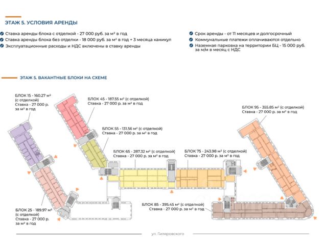 АРЕНДА ОФИСНЫХ БЛОКОВ ОТ СОБСТВЕННИКА от 300 кв.м до 500 кв.м в уникальном историческом 5-ти этажном здании в развитом районе Москвы с удобным расположением (5 минут от метро) - на ул. Гиляровского, 65с1. ЗДАНИЕ ОСНАЩЕНО современной инженерной и телекоммуникационной инфраструктурой, что создает оптимальные условия для продуктивной работы. УДОБНОЕ ЦЕНТРАЛЬНОЕ РАСПОЛОЖЕНИЕ ЗДАНИЯ КАК ОБЩЕСТВЕННЫМ, ТАК И ЛИЧНЫМ ТРАНСПОРТОМ: - до ст.м./БКЛ/МЦД Рижская и ст.м. Проспект Мира - 5 минут пешком - до ст.м. Сухаревская - 10 минут пешком - до просп. Мира - 160 метров - до ТТК - 350 метров - до Садового кольца - 1,5 км - до Москва-Сити - 20 минут на автомобиле ПРЕДЛОЖЕНИЕ ПО АРЕНДЕ ОФИСНЫХ БЛОКОВ: Предлагаются офисные блоки класса В+ разного метража - 32 лота от 300 кв.м до 500 кв.м на разных этажах, как с отделкой, так и без отделки. Разнообразная конфигурация планировочных решений блоков позволяет арендатору организовать офисное пространство на свой вкус. НАЛИЧИЕ ЛОТОВ И УСЛОВИЯ АРЕНДЫ ПРЕДСТАВЛЕНЫ НА ЗАГРУЖЕННОЙ СХЕМЕ КАЖДОГО ЭТАЖА. УНИКАЛЬНОСТЬ ЗДАНИЯ: - престижное расположение в ЦАО. - отличная транспортная доступность как общественным, так и личным транспортом. - развитая инфраструктура в шаговой доступности: рестораны, кафе, магазины, гостиницы, банки, фитнес-центры, медицинские учреждения, объекты сферы услуг. - популярные парковые зоны и культурные центры: ботанический сад МГУ Аптекарский огород, Екатерининский парк, театры, музеи, планетарий, выставочные центры. - малоэтажная застройка района. - собственная территория комплекса и наземный паркинг. - компактные размеры здания - 13 600 м2, обеспечивающие камерность и комфорт размещения. - уникальная историческая архитектура здания. - сохранившиеся оригинальные детали: историческая кладка стен, оконные проемы, декоративные элементы, неоштукатуренные кирпичные стены. - атмосферные интерьеры в стиле лофт.