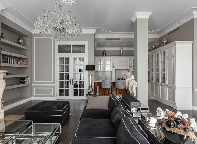 Огромные панорамные окна в пол, около 5 метров, открывают вид на город и наполняют интерьер естественным светом.