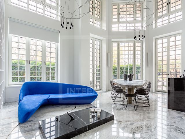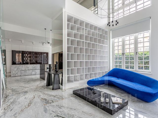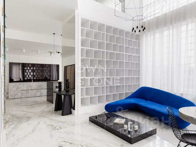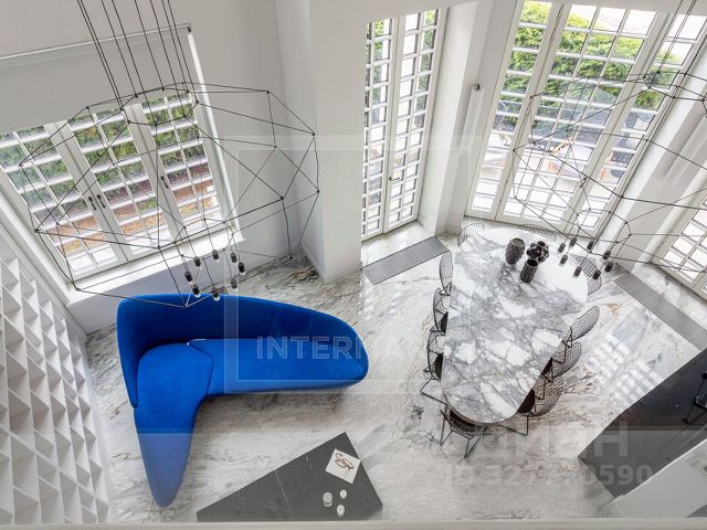 Планировка: 1 этаж кухня-гостиная, спальня со своим санузлом и гардеробной комнатой, домашний кинотеатр, гардеробная, гостевой с/у, постирочная; 2 этаж: гостиная, зона отдыха с домашним кинотеатром, 2 спальни со своими санузлами, гардеробная, гостевой санузел, кладовая. Антресоль: 3 спальни, гардеробная, 2 ванные комнаты. Высота потолков - 3,60 м. В квартире выполнена новая дизайнерская отделка с применением натуральных материалов(дерево, природный камень, мрамор).