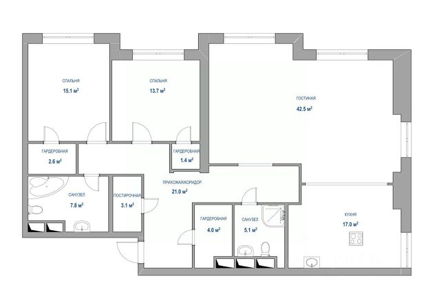 Планировка: большая кухня-гостиная 37м², 2 изолированные комнаты 15м² и 19м², два санузла с ванной/душевой, гардеробная, тёплая лоджия.