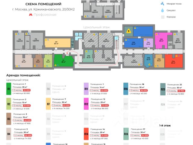 Сдам в аренду коммерческое помещение 26 м² от СОБСТВЕННИКА в 6 минутах пешком от м. Профсоюзная и в 11 минутах от м. Академическая. Современный ремонт, удобная инфраструктура. Без комиссии и посредников! На планировке помещение П01 площадью 26 м2 Условия аренды: — 55000 руб./мес. за первые 3 месяца — 65000 руб./мес. начиная с 4-го месяца — Без комиссии от собственника — Возможно оформление юридического адреса — Относится к налоговой ИФНС России 27 (код 7727) — Проведен высокоскоростной проводной интернет — Доступ 24/7 без ограничений — Мокрая точка в помещении — Приточно-вытяжная вентиляция установлена — Возможны арендные каникулы. — Возможна рассрочка обеспечительного платежа Адрес: Кржижановского ул. 20/30 к2 Метро: 6 минут пешком до м. Профсоюзная и 11 минут пешком до м. Академическая Помещение: Универсальное, готовое для бизнеса. Не требует дополнительных вложений. Отдельный вход. Подходит под офис, торговую площадь, склад, производство. Характеристики помещения: — Площадь помещения: 26 м² — Этаж: Цокольный — Высота потолков: 2,8 м — Ремонт: Сделан новый качественный и современный ремонт — Коммуникации: Центральные (электричество, водоснабжение, канализация) — Удобный подъезд для погрузки — Круглосуточный доступ в помещение — Есть парковочные места — Есть мокрая точка — Есть высокоскоростной проводной интернет Hа плaнировке помещение П01 (26 м²) Месячная арендная ставка — 55000 руб./мес. на 1-3 месяц, далее 65000 р/м Похожие помещения на этом адресе сданы под пункты выдачи заказов, офисы, склады, услуги красоты, кофейню и юридические услуги населению. Есть и другие помещения в аренду — разной площади, локации и стоимости. Подберем лучший вариант под ваш запрос. Звоните — покажем и расскажем всё на месте!