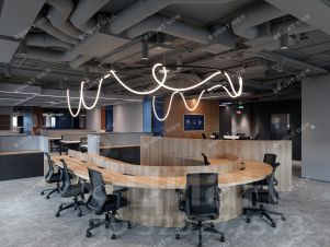Офис выполнен в современном стиле лофт. Панорамный окна открывают красивый вид на город.