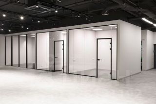 Смешанная планировка: open space, два отдельных кабинета, из стеклянных перегородок, пол керамогранит, стены покрашены в два слоя водоэмульсионной...