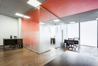 Офис поделен на два помещения за счет установленных стеклянных перегородок.