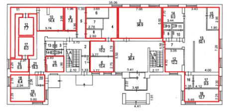 12 офисных помещений на втором и третьем этаже трехэтажного здания, площадью: