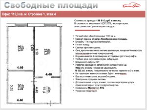 БЕЗ КОМИССИИ! Бизнес-центр класса B. Сдаётся под офис блок на 4-м этаже площадью 115 кв.м. Стандартная офисная отделка, требуется косметический ремонт. Кондиционер (сплит), вентиляция. Есть охрана.НДС и эксплуатационные расходы включены. Краснобогатырская улица, 8...