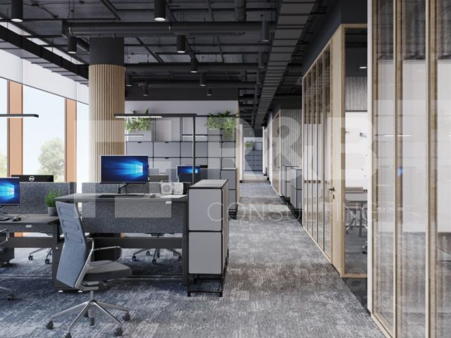Офис с качественной отделкой с БОЛЬШИМ ПАНОРАМНЫМ ОКНОМ В АТРИУМ.