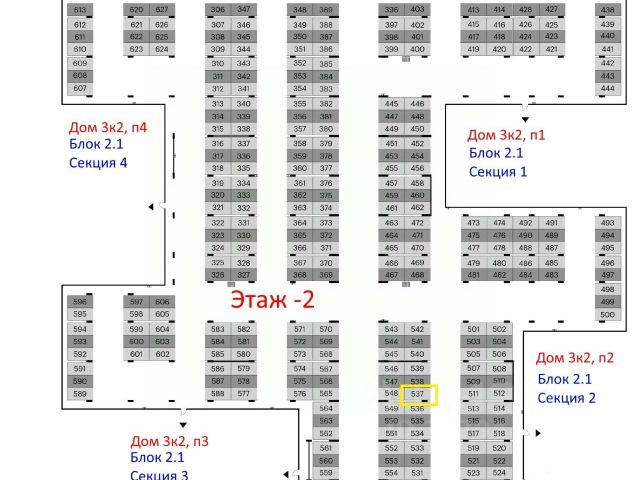 Сдается парковочное место площадью 13,3 кв. метра на минус 2ом этаже. Ближе всего ко 2му и 3му подъезду (секции) 2го корпуса, чуть дальше до 1го. Сосед с одной стороны, с другой короткий пилон, не мешает выходу из авто.