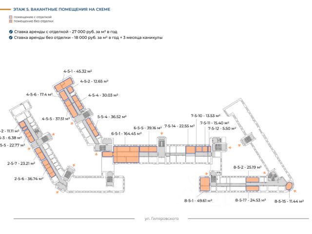 Предлагаются комфортные офисы класса В+ разного метража - 38 лотов от 10 кв.м (этажи 5, 3, 2 и 1).