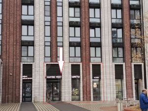 Вход, витринные окна с фасада корпуса. Соседние помещение арендует супермаркет "Магнолия" и мини фитнес.