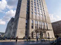 Современное двенадцатиэтажное строение, отличающееся панорамным остеклением и качес...