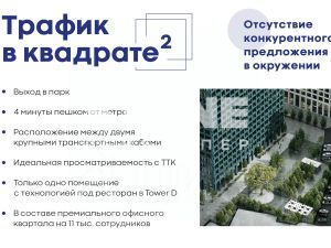 Аренда торгового помещения на 1 премиального офисного квартала STONE Towers на 11 000 сотрудников. Высокий трафик обеспечен сотрудниками самого квартала, жителями района, а также соседних бизнес-центров.