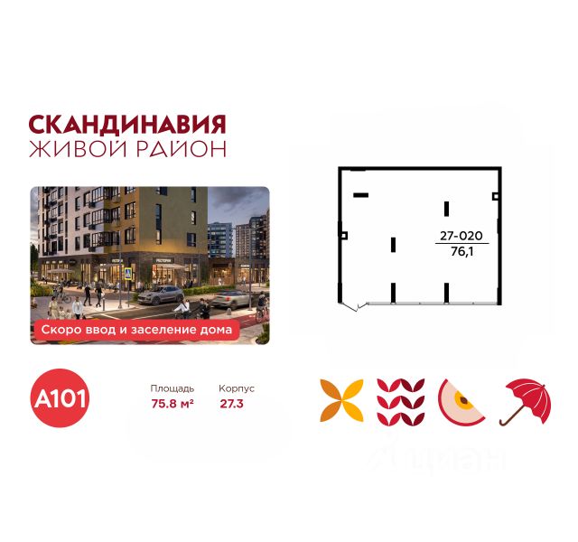 Сдается помещение площадью 75.80. на 1-м этаже ЖК "Скандинавия". Трафик 874 человек в день.