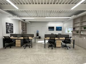 Планировка: open space площадью 100 м2 на 17 рабочих мест, переговорная/кабинет 10м2, кухня-10 м2.