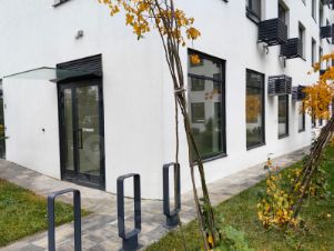 Перед зданием — зелёная зона и лес — приятный вид и спокойная атмосфера
