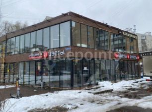 Помещение с двумя входами, один из которых рядом с остановкой общественного транспорта.