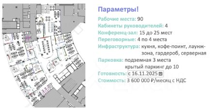 Кабинеты руководителей: 4 Конференц-зал: 15 до 25 мест Переговорные: 4 по 4 места Инфраструктура:...