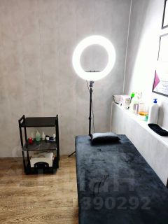 В кабинете кушетка, кольцевая лампа, тумба, стул мастера, комод, большое зеркало, напольная вешалка для верхней одежды.