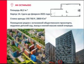 957706 . Предлагаем помещение свободного назначения формата street-retail в ЖК "Остафьево", площадью 69.83 кв. м, расположенное на первом этаже 14-этажного жилого дома. Корпус: 13.