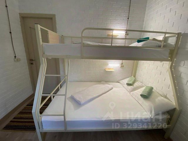 Двухъярусная кровать, нижний ярус-двуспальная кровать, верхний ярус-односпальная. Имеется дополнительное спальное место - кресло кровать. В номере имеется тумба, вешалка для одежды, зеркало, прикроватные полочки, розетки, индивидуальное освещение у каждого яруса кровати.