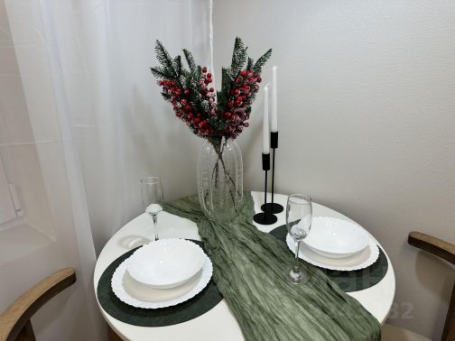 И всё что необходимо для комфортного проживания: посуда, косметические принадлежности, шкаф, стол со стульями, комод, кресло, полотенце-сушилка, зеркала.