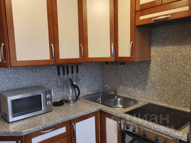 На кухне установден кухонный гарнитур и вся необходимая техника для удобства - ПММ, микроволновка, встроенный духовой шкаф, керамическая варочная панель, холодильник, вытяжка, пылесос, электрочайник.