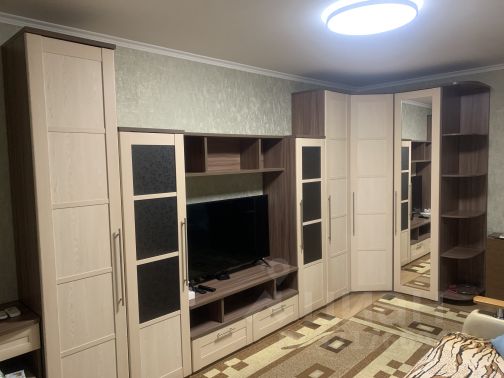 - Гостиная 17,8м2: Приятный на ощупь и раскладывающийся (Г-образно или на две секции до 3-х гостей) диван, Гардероб/Шкаф, "Горка", Письменный стол и др.