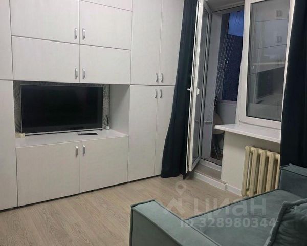 - гостиная с раскладным диваном, креслом, большим комодом и телевизором. К гостиной примыкает большой балкон с панорамным остеклением. При желании можно оборудовать рабочее место или лаунж зону.