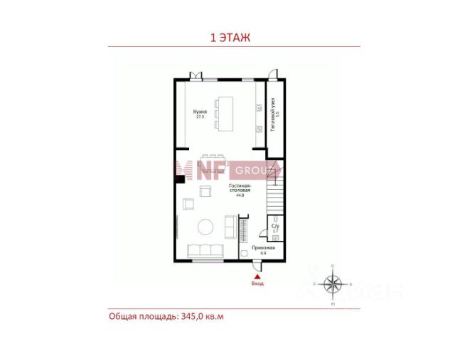 - 1 этаж - кухня-столовая 44 кв.м, гостевой санузел с душем 5кв.м.,просторная прихожая с вместительными зонами хранения.