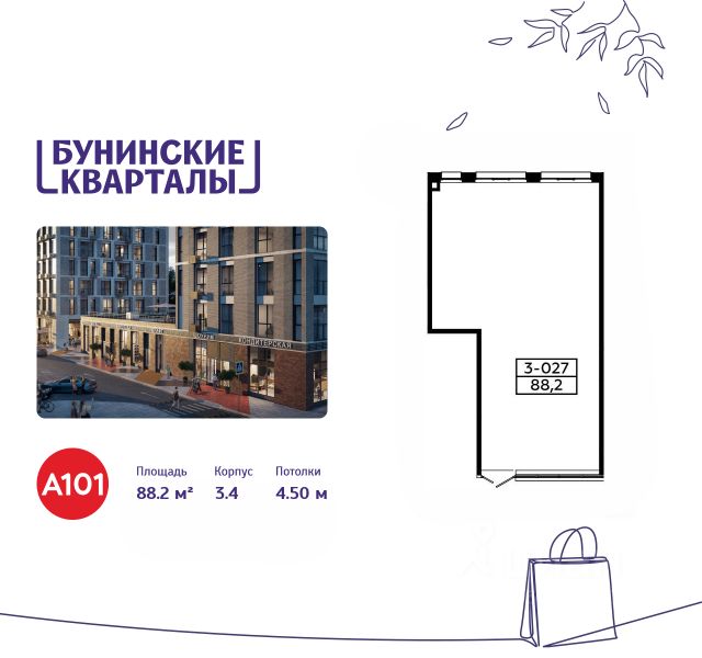 Сдается помещение площадью 88.20. на 1-м этаже ЖК "Бунинские кварталы".