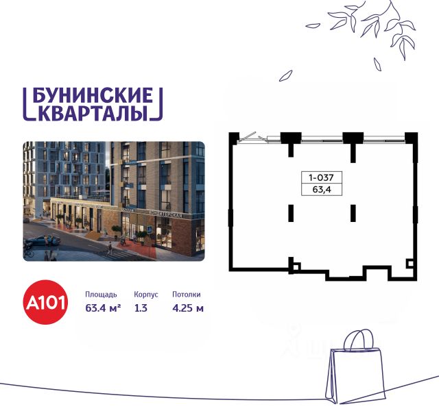 Сдается помещение площадью 63.40. на 1-м этаже ЖК "Бунинские кварталы".