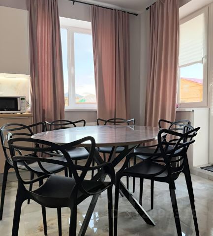 Светлая кухня-гостиная с панорамными окнами. В ней установлен раскладной диван с просторным спальным местом 160х200 см. Кухня оснащена всей необходимой посудой (на 6 персон), бытовой техникой, включая посудомоечную машину и капсульную кофемашину. Питьевая вода поступает из артезианской скважины.