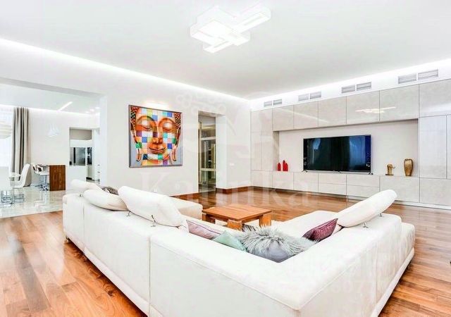 Основной дом: гостиная с кинотеатром, кухня, кабинет, спортзал, мастер-спальня с хамамом и балконом, 2 спальни, детская.