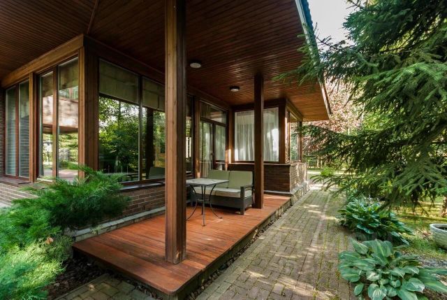 На участке выполнен ландшафтный дизайн с зонированием: зеленые лужайки, открытая веранда с барбекю, фруктовый сад, аккуратный огородик, теплица, погреб, домик персонала, парковка на 4-6 автомобилей. Зеленая изгородь из хвойных деревьев укрывает усадьбу от посторонних глаз.