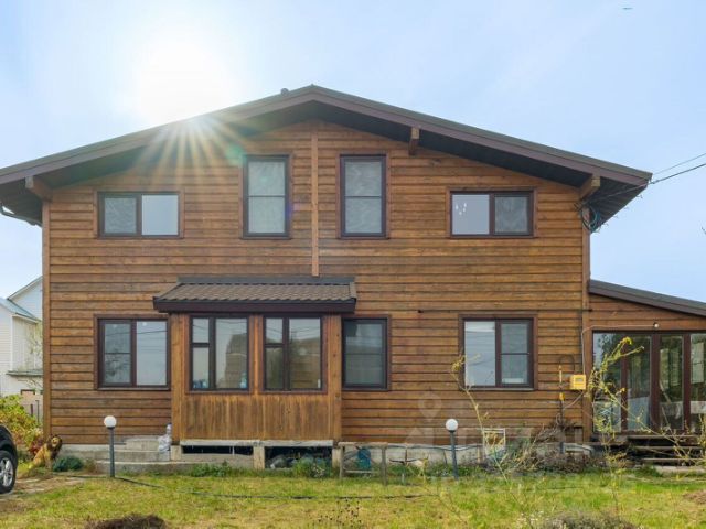 Материал стен: бревно. Облицовка стен: стены обшиты окрашенной деревянной доской (сайдингом), цоколь облицован натуральным камнем.