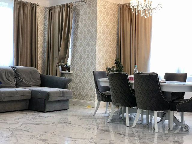 Мебель, оборудование: дом полностью меблирован: в зоне кухни-гостиной установлен кухонный гарнитур с островом и полу барным столом (производство РФ) со встроенной техникой: посудомоечная машина, микроволновая печь, холодильники Bosh (также и в постирочной), обеденный стол с мягкими стульями-креслами на 8 персон, кухонные комоды для посуды. Стиральная машинка, телевизоры, пылесос - все в наличии. В спальнях - кровати, комоды, кресла, столы, тумбочки - все укомплектовано для проживания. Во всех помещениях карнизы, шторы, красивые дизайнерские люстры и светильники, картины..