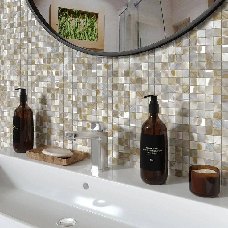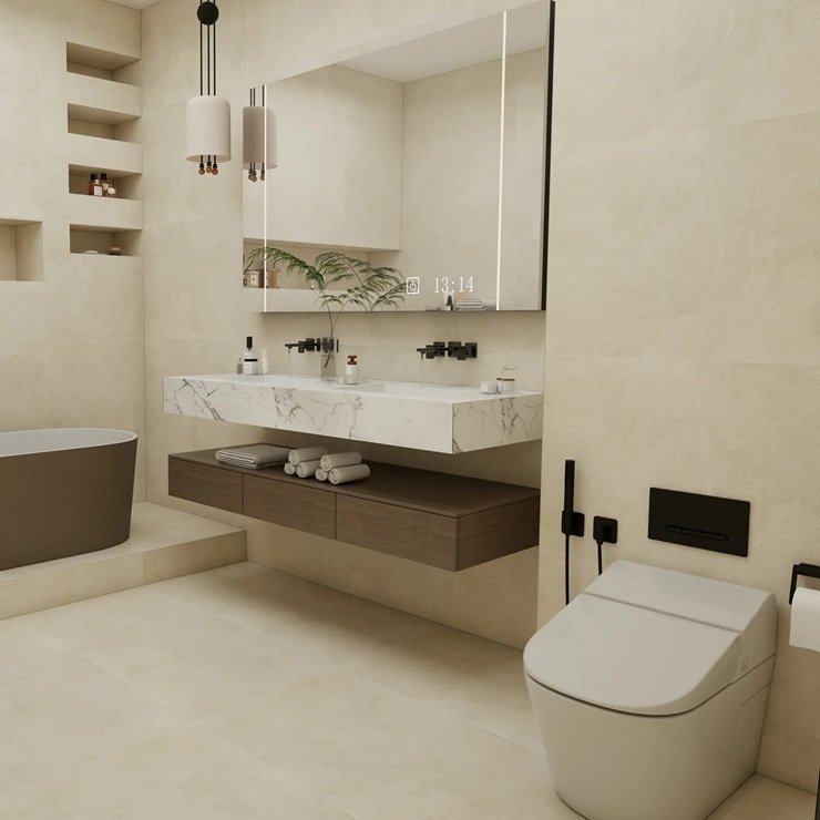 Ванные всё чаще оформляют в приглушённых, неярких тонах: бежевом, ванильном, светло-сером, серо-зелёном, глиняном, тёплом белом. Эти цвета хорошо сочетаются с текстурами, которые имитируют природные материалы, такие как древесина, бетон, камень.