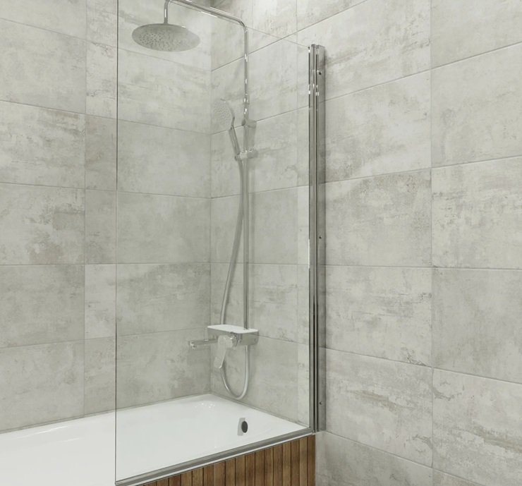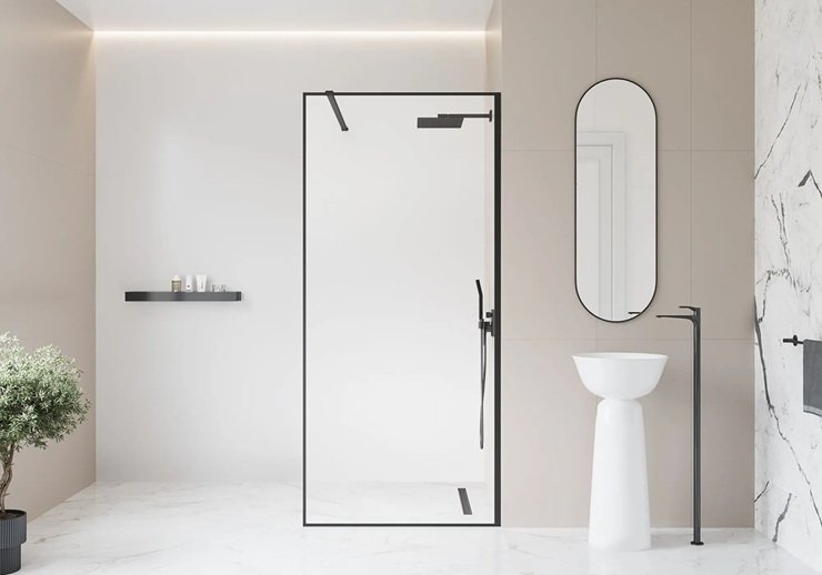 Прозрачная душевая перегородка защищает от брызг. Чтобы вода не застаивалась, важно сделать правильный уклон пола к трапу — около 1–2%.