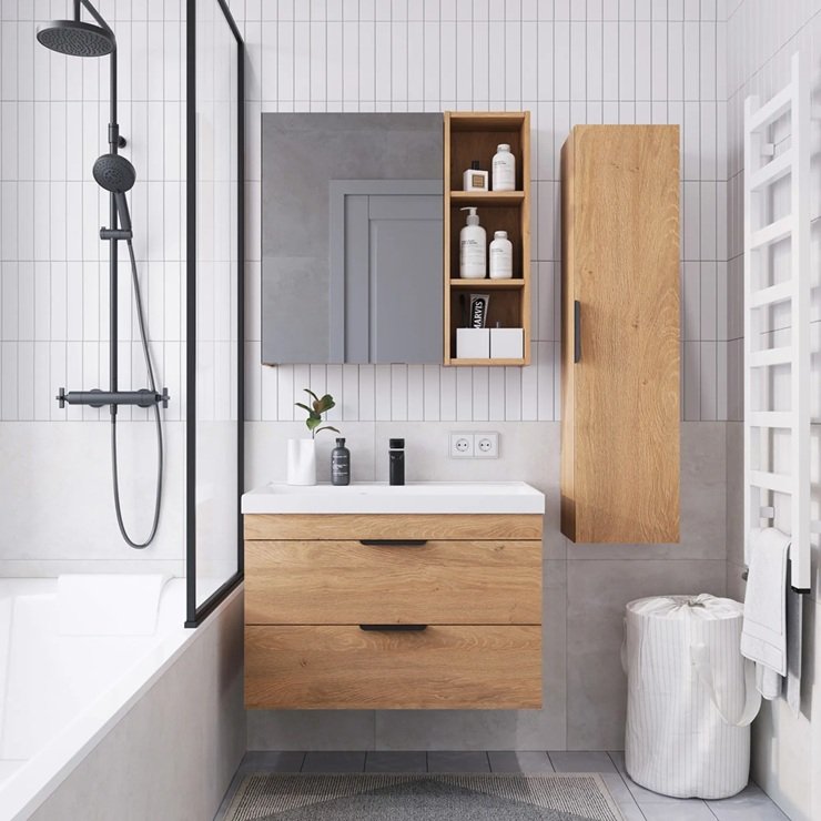 Порядок — основа уюта. В этом помогут встроенные ниши в стене (например, в душевой зоне для шампуней) или системы хранения внутри мебели: