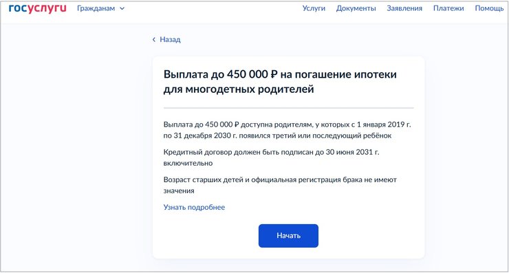 Повторное участие в программе возможно, но при условии оформления нового ипотечного кредита и при рождении ещё одного ребёнка, например четвёртого, до конца 2030 года. При этом заёмщиком по новой ипотеке должен быть тот, кто ранее не подавал заявление на выплату. То есть один и тот же человек может получить 450 тыс. рублей от государства на выплату ипотеки только один раз.