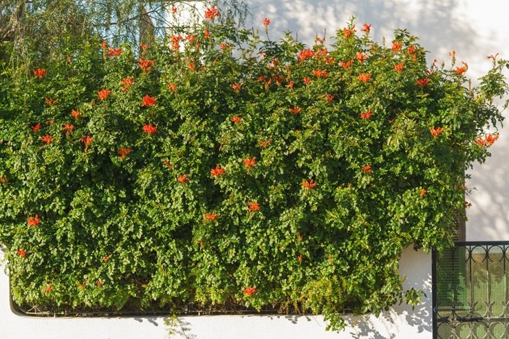 Вьющиеся растения чаще используют вдоль сетчатых и кованых ограждений, когда нужно закрыть двор от посторонних взглядов.