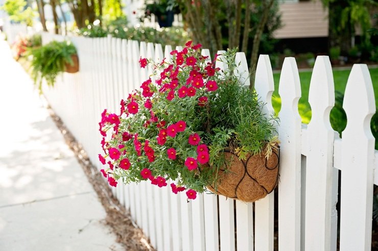 Петунию можно высаживать напрямую в грунт или в кашпо, чтобы потом закрепить его на заборе. Для подвесных ёмкостей выбирайте ампельные и каскадные сорта, объём контейнера — от 3 литров на одно растение.