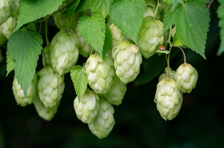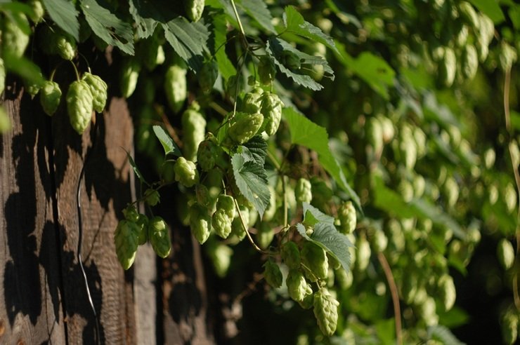 Многолетняя лиана с крупными резными листьями и свисающими шишками, которая за сезон вырастает до 6 метров и плотно оплетает забор или опору.