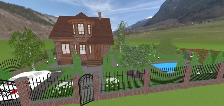 Чтобы всё продумать, воссоздайте план вашего участка. Нарисуйте территорию нужной формы, сделайте ограждение из профлиста, сетки-рабицы или деревянный забор, а затем настройте цвет и материал. После этого добавьте насаждения и оцените результат в 3D-формате или режиме виртуальной прогулки.