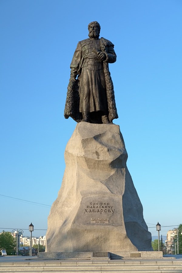 Перед вокзалом стоит памятник Ерофею Хабарову — землепроходцу, в честь которого и назван город. Историки описывают его как неудачливого мельника, который отправился на восток из-за вражды с местным воеводой. Он воевал с сибирскими князьями, закладывал остроги, прошёл всё Приамурье и в середине XVII века составил первые карты этих мест.