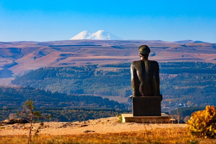 Памятник Лермонтову на площадке «Красное Солнышко» и потрясающий вид на Эльбрус, который оттуда открывается. Фото: saiko3p / Shutterstock / Fotodom